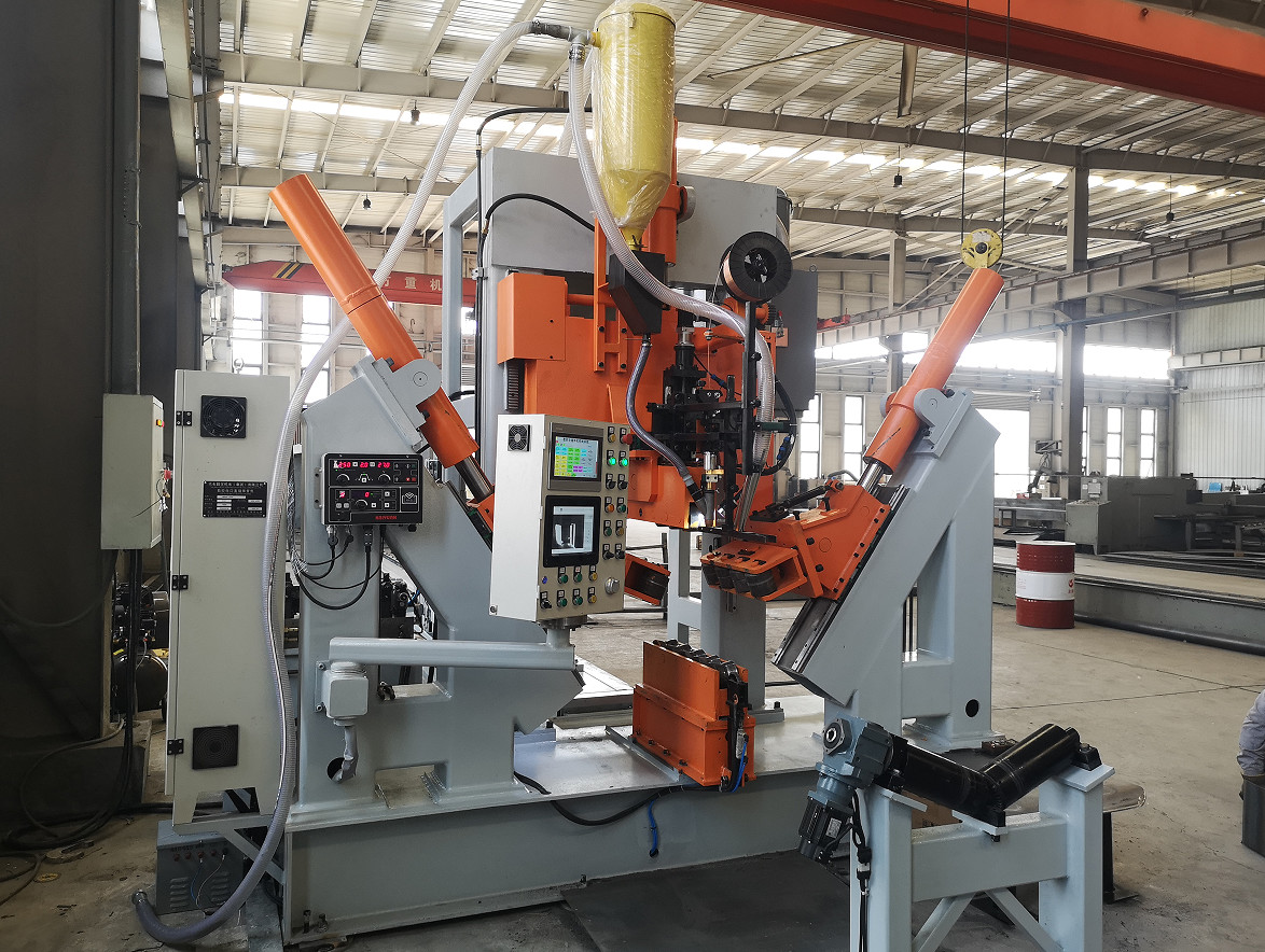 این دستگاه معمولاً برای جوشکاری تیرهای چند ضلعی و مخروطی با اندازه متوسط مناسب است، به خصوص برای تیری که فقط یک یا دو درز دارد. این یک خط جوشکاری خودکار است. این کالسکه مجهز به موتور با سرعت قابل تنظیم است که می تواند تیر را به حرکت درآورد. سیلندر هیدرولیک باعث می شود چرخ فشار، تیر را محکم کند و همزمان جوشکاری کند.